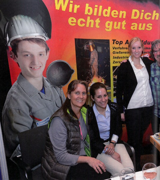 Um potenzielle Bewerber auf das Unternehmen aufmerksam Zumachen, sind die Edelstahlwerke Schmees aktiv auf Messen und Veranstaltungen unterwegs. Am Standort Pirna nimmt das Werk beispielsweise regelmäßig an der langen Nacht der Industrie teil. Einen weiteren Bereich der unternehmenseigenen Nachwuchswerbung bildet die BerufsOrientierungsBÖrse (BOB). „Die BOB 2014 fand Mitte Mai in der Langenfelder Stadthalle statt und ist durch die rheinische Standortnähe eine gute Möglichkeit, mit interessierten Jugendlichen persönlich ins Gespräch zu kommen“, erklärt Schmees-Besgen. In diesem Jahr trafen über 2500 Schüler auf 112 Firmen, Schulen und Universitäten, um sich über mögliche Aus und Weiterbildungsangebote zu informieren. „Wir haben schon einige Erfahrungen auf Messen gesammelt und haben unsere Präsentation an die jungen Besucher angepasst“, erläutert Susanne Schmees-Besgen weiter. „Neben informativen Broschüren verteilen wir Energydrinks und USB-Sticks, die an das Corporate Design angepasst sind. Wir sind immer wieder überrascht, wie schnell die Schüler mitbekommen, welche Präsente es an unserem Stand gibt. Danach kommen alle angerannt“, fügt sie lachend hinzu. Einen besonderen Schwerpunkt legt das Unternehmen auf die Präsentation der Ausbildung zum/zur Verfahrensmechaniker/in. In diesem Bereich ist das Personaldefizit besonders groß. „Die Erfahrung hat gezeigt, dass die Schüler mehr Interesse zeigen, wenn etwas Aktives am Stand passiert“, erklärt Schmees Besgen. „Dazu lassen wir uns immer etwas Besonderes einfallen, zeigen aber auch Dinge zum Anfassen, wie beispielsweise Probekörper.“ Schwierig gestaltet sich heutzutage die zielgruppenspezifische Ansprache der Schüler. Eine Maßnahme stellte die Entwicklung eigener Azubibroschüren dar. Stichpunktartig werden die Ausbildungsberufe in quadratischen Faltblättern schnell und informativ dargestellt. Bei der Bebilderung setzen die Edelstahlwerke Schmees grundsätzlich auf eigene Fotos. „Wir verzichten weitgehend auf den Einsatz von Bilddatenbanken. Die gezeigten Personen sind allesamt Mitarbeiter in unserem Hause“, erklärt die Personalleiterin. „Aber auch das Jugendmagazin YouCast aus der Nachwuchskampagne Powerguss des Bundesverbands der Deutschen Gießerei-Industrie ist ein gutes Hilfsmittel, da diese genau das Interesse der Schüler trifft.“ Problematisch gestaltet sich allerdings die Ansprache des potenziellen Nachwuchses in den sozialen Medien, wie beispielsweise Facebook. „Dieser Schritt muss genau geplant sein. Zum einen muss die technische Realisierung im Unternehmen vorbereitet werden, da bei der Nutzung von Webinhalten immer Gefahren für die lT-Infrastruktur entstehen, die es abzuwägen gilt, zum anderen müssen aber auch personelle Ressourcen verfügbar sein, die das Thema Social Media mit Eigenengagement betreiben. Getreu dem Unternehmensmotto mit Herz und Verstand. Derzeit entwickeln wir ein Konzept, welches in naher Zukunft die Nutzung von sozialen Medien ermöglichen soll“, führt Schmees-Besgen aus.