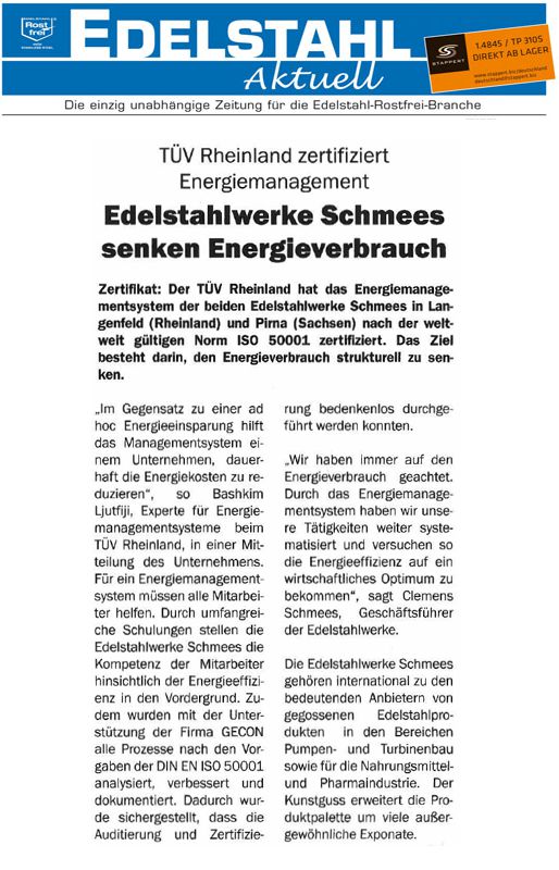 „Im Gegensatz zu einer adhoc Energieeinsparung hilft das Managementsystem einem Unternehmen. dauerhaft die Energiekosten zu reduzieren", so Bashkim Ljutfiji, Experte für Energiemanagementsysteme beim Tüv Rheinland, in einer Mitteilung des Unternehmens. Für ein Energiemanagementsystem müssen alle Mitarbeiter helfen. Durch umfangreiche Schulungen stellen die Edelstahlwerke Schmees die Kompetenz der Mitarbeiter hinsichtlich der Energieeffizienz in den Vordergrund. Zudem [...]